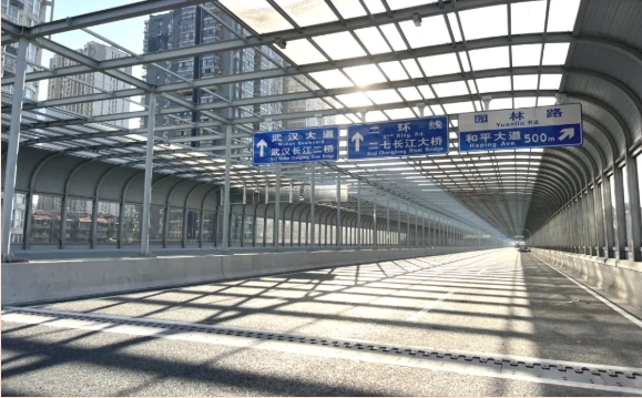 ? ? 項(xiàng)目設(shè)計(jì)團(tuán)隊(duì)始終秉持 “輕量化、智能化、綠色化” 理念,多項(xiàng)技術(shù)應(yīng)用填補(bǔ)區(qū)域空白,樹立行業(yè)新標(biāo)桿。在鋪裝材料與工藝上,主線高架鋼箱梁橋面采用澆注式瀝青鋪裝,相比傳統(tǒng)方案減重16%,既降低橋梁結(jié)構(gòu)負(fù)荷、提升安全性,又縮短施工周期;鋼箱梁采用U肋全熔透智能焊接,大幅提高結(jié)構(gòu)疲勞壽命,積極推進(jìn)鋼箱梁U肋焊接工藝的發(fā)展。尤為引人注目的是,本項(xiàng)目集中展現(xiàn)了三大創(chuàng)新亮點(diǎn):它擁有全國最長的連續(xù)全封閉聲屏障,是湖北省首例“光伏+市政”的融合實(shí)踐,更在武漢率先實(shí)現(xiàn)了聲屏障光伏發(fā)電的應(yīng)用,為綠色市政建設(shè)樹立了新的樣板。